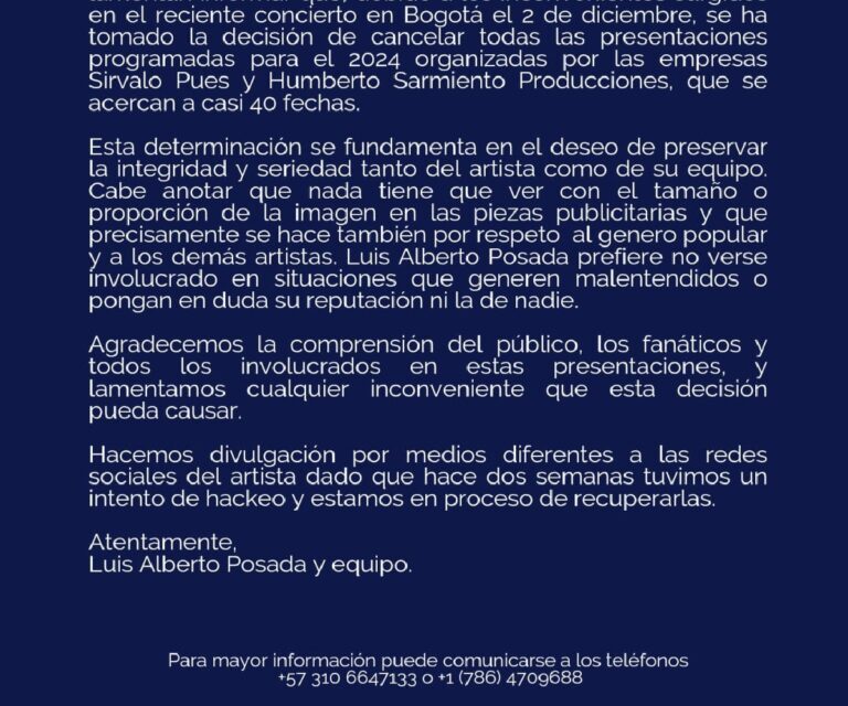 En su boletin informativo, Posada, que tendria nuevo amor, lamento las molestias que su decision pueda causar y pide comprension del publico, fanaticos y los demas involucrados en esas presentaciones.