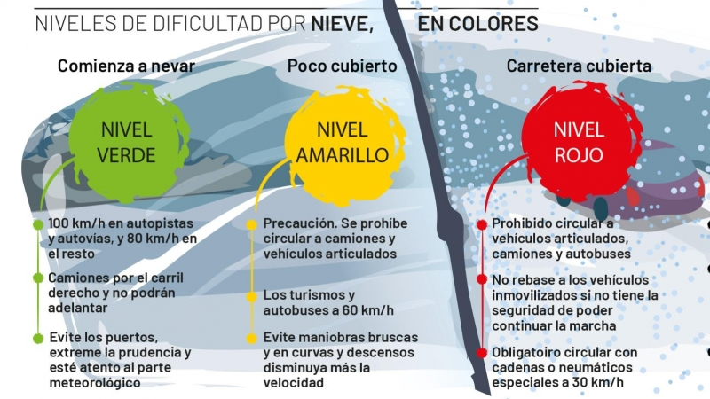 En todo caso, si cae nieve y cuaja, la DGT recomienda conducir siguiendo las trazadas creadas por el paso de otros vehiculos, ya que habra menos posibilidad de hielo.