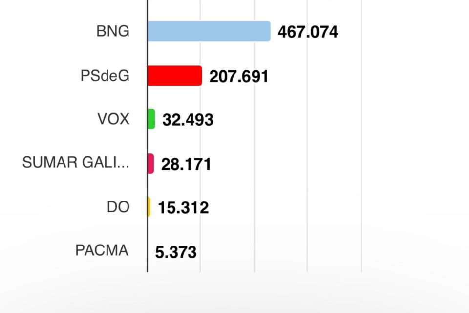 En la izquierda, el BNG obtiene 467.074 votos, el PSdG 207.691 votos y Sumar 28.171 votos. Esto situa al bloque de la izquierda en 702.936 votos.
