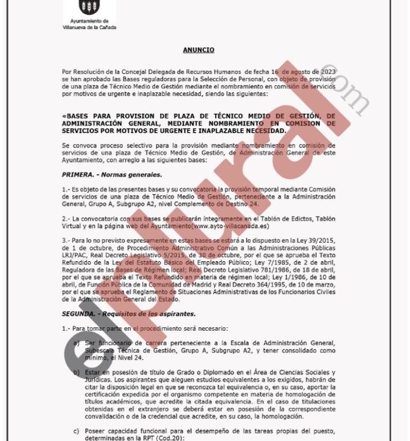 Con media España de vacaciones, el Ayuntamiento de Villanueva de la Cañada, un feudo del Partido Popular en la Comunidad de Madrid donde el PP cuenta con 16 de los 21 concejales existentes (Vox tiene 3 ediles y el PSOE 2), decide publicar, con fecha 16 de agosto de 2023, las bases para la “provision de plaza de tecnico medio de gestion, de administracion general, mediante nombramiento en comision de servicios por motivos de urgente e inaplazable necesidad”.
