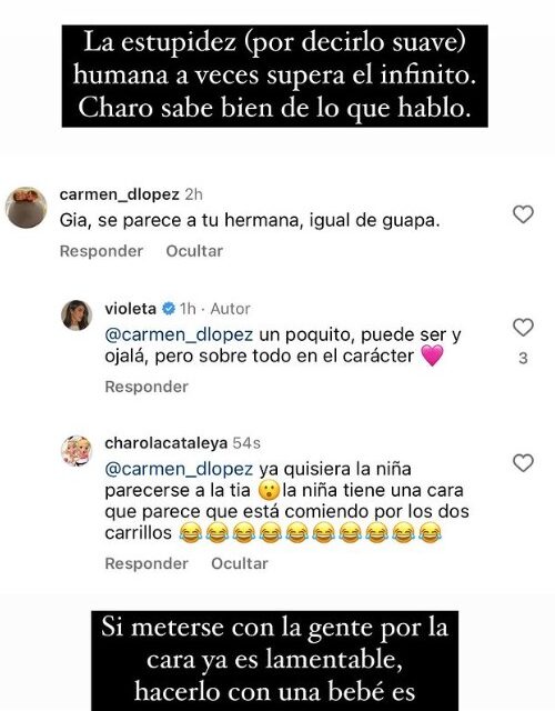 Este mensaje ha sido con el que Violeta ha estallado y se ha desfogado por sus historias de Instagram. “La estupidez (por decirlo suave) humana a veces supera el infinito. Si meterse con la gente por la cara ya es lamentable, hacerlo con una bebe es vomitivo“, ha apuntado la de Valencia en referencia al comentario recibido y en defensa de su pequeña.