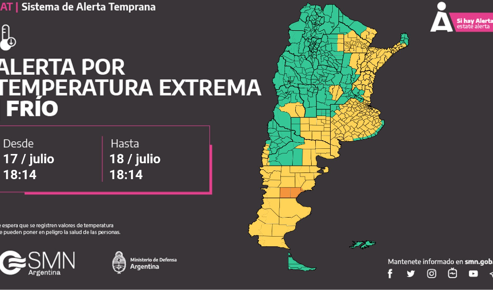 Indica que las bajas temperaturas afecta a grupos de riesgo con problemas de salud y de ciertas franjas etarias. El alerta alcanza a las provincias de Santa Cruz, Chubut, zona cordillerana de Rio Negro y sur de Neuquen, centro de Mendoza, La Pampa, este de Rio Negro, casi toda la provincia de Buenos Aires, sur de Cordoba, Entre Rios, Corrientes, norte de Santa Fe, Chaco, parte de Santiago del Estero, Formosa y Misiones.
