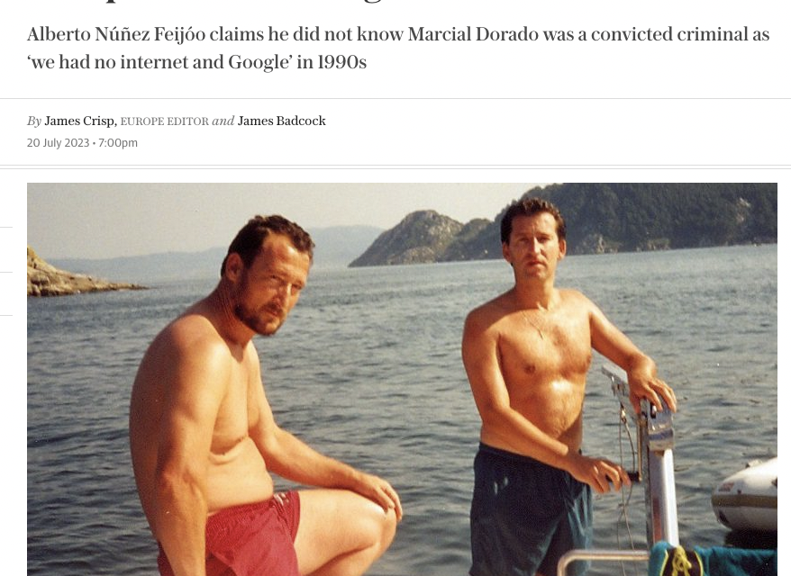 “El favorito para las elecciones españolas, obligado a retroceder tras las imagenes con un narcotraficante”, dice The Telegraph sobre el candidato del PP, refiriendose a las palabras de Feijoo en las que en una entrevista con laSexta trataba de contextualizar su relacion con Dorado: “En aquel momento no tenia ninguna acusacion por ello, ahora es mas facil saber cosas porque hay Internet, porque hay Google, en aquel momento no”.