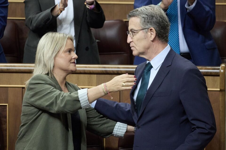 La senadora del PP, Maria del Mar Blanco y el presidente del PP, Alberto Nuñez Feijoo, se abrazan durante una sesion de control al Gobierno, en el Congreso de los Diputados, a 9 de octubre de 2024