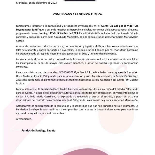 “Lamentamos informar a la comunidad y a todos los involucrados en el evento Un gol por la Vida “Las Leyendas por Santi” que, a pesar de nuestros esfuerzos incansables, nos vemos obligados a cancelar el evento programado para el domingo 17 de diciembre del 2023. Esta dificil decision se ha tomado debido a la falta de garantias y apoyo por parte de la Alcaldia de Manizales, bajo la administracion del señor Carlos Mario Marin Correa”, se lee en el comunicado de la organizacion.